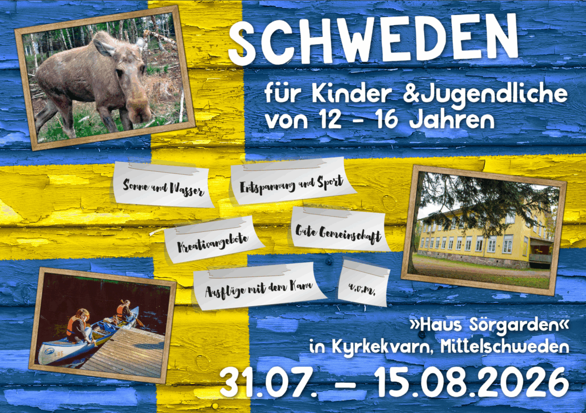 Hej hej! Für die nächsten Schwedenfreizeit vom 31.07.2026 bis zum 15.08.2026 in Schweden sind noch Anmeldungen möglich. Freut euch wieder auf viele Aktivitäten, wie Kanu fahren & Zelten, Lagerfeuer & Stockbrot, Tischtennis & Volleyball oder Grillen und Sonnenbaden.