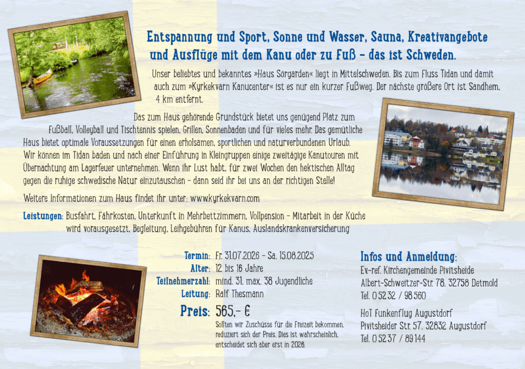 Hej hej! Für die nächsten Schwedenfreizeit vom 31.07.2026 bis zum 15.08.2026 in Schweden sind noch Anmeldungen möglich. Freut euch wieder auf viele Aktivitäten, wie Kanu fahren & Zelten, Lagerfeuer & Stockbrot, Tischtennis & Volleyball oder Grillen und Sonnenbaden.